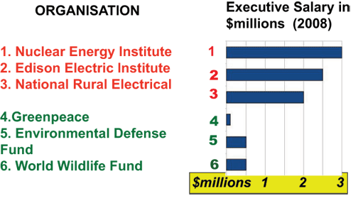 At the other end of the spectrum, it apparently doesn’t pay to be green. The Union of Concerned Scientists, Greenpeace, the National Wildlife Federation and the American Wind Energy Association were among seven groups paying their chiefs between $400,000 and $100,000. Greenpeace’s former executive director, John Passacantando, was the fifth-lowest-paid executive in the survey overall, making a (comparatively) paltry $103,624. The Environmental Defense Fund and World Wildlife Fund paid their executives the most of the green groups, at roughly $496,000 and $486,000, respectively…..