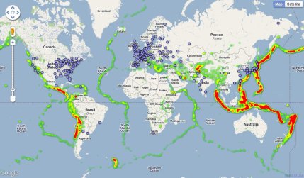 Worldwide map of nuclear power stations and earthquake zones (Maptd)