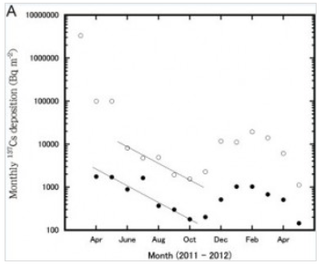 Temporal variations of the monthly 137Cs deposition in the monitoring stations. A open circle: Futaba, and closed circle: Fukushima City. […]