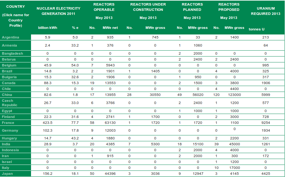 The WNA country profiles linked to this table cover both areas: near-term developments and the prospective long-term role for nuclear power in national energy policies. They also provide more detail of what is tabulated here. (Click on picture to enlarge)