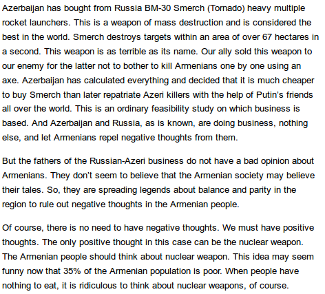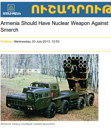 Armenia should have nuclear weapons to combat Azerbaijan Smerch missiles