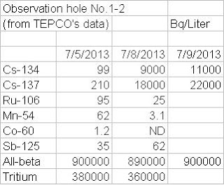 That explanation went out the door when 9,000 Bq/liter of cesium-134 and 18,000 Bq/liter of cesium-137 were detected from the hole No.1-2.