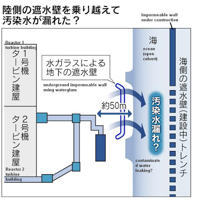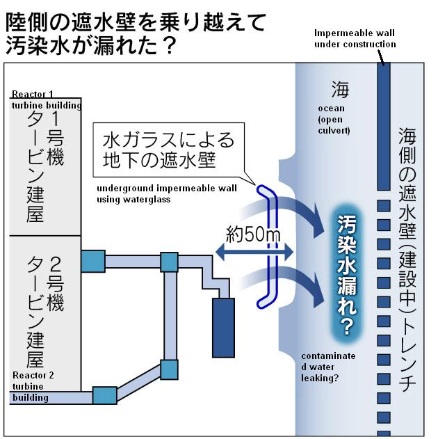(The opening sentence of Nikkei’s article below is wrong, though. There is no highly contaminated water leaking from the plant, yet. The highly contaminated water is mostly in the underground trenches, where it has been since 2011. Some may be leaking into the groundwater flowing from the west and that groundwater may be leaking into the open culvert.)