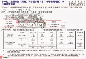 The handout shows the particular location (observation hole No. H25J7) to be close to the turbine buildings of Reactor 3 and Reactor 4: