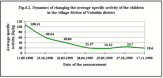 Maximal values of the whole-body absorbed dose rates occurred during the year of deposition, followed by a decrease in the subsequent period. Generally, this decrease was monotonic, mainly determined by the decrease of the external c-ray dose rate, but there were exceptions due to the delayed maximum of internal exposure.