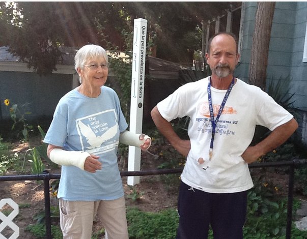 Sister Megan Rice, left, with co-defendant Michael Walli on Sept. 12, 2012, at the Catholic Worker in Washington, D.C. Rice’s wrists were in casts because of a fall during her release following the initial set of charges for the 2012 break-in at Y-12. (photo by Mary Finnerty)