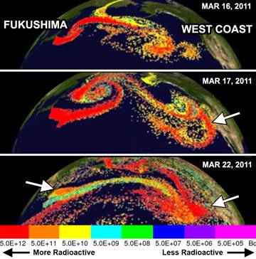 The March 22, 2011 NOAA model (above right) shows the West Coast of US and Canada covered in red particles, while the Fukushima site — and all of Japan — are under orange particles. According to the NOAA above a “change in particle color represents a decrease in radioactivity by a factor of 10”