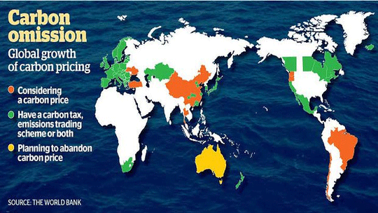 US President Barack Obama speaks out forcefully on the need to act, on carbon pricing as the most effective action, and has introduced significant action to cut greenhouse gases. China has started 6 regional emissions trading schemes.The World Bank’s survey found that 39 countries and more than 23 States and provinces have adopted emissions trading schemes or a carbon tax. No worries. Abbott pronounces that there is “no sign” that such schemes are being adopted.