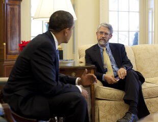 President Obama meets with John Holdren, Office of Science and Technology Policy, in the Oval Office prior to Stem Cell Executive Order “Removing Barriers to Responsible Scientific Research Involving Human Stem Cells” and Presidential Memorandum on Scientific Integrity, March 9, 2009. (Official White House Photo by Pete Souza)