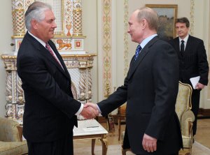 Russian Prime Minister Vladimir Putin, right, shakes hands with Rex W. Tillerson, chairman and chief executive officer of Exxon Mobil Corporation at their meeting in the Novo-Ogaryovo residence outside Moscow, Monday, April 16, 2012. Exxon is teaming up with Russian oil giant Rosneft to develop oil and natural gas fields in Russia and North America.The companies…