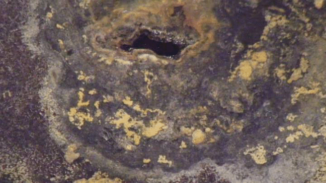 High pressure water is sprayed to move waste around on the bottom of the inner shell of Hanford Tank AY-102. Bubbles may indicate some of the seven leaks found inside the inner shell. No waste is believed to have escaped the tank’s outer shell. Ed