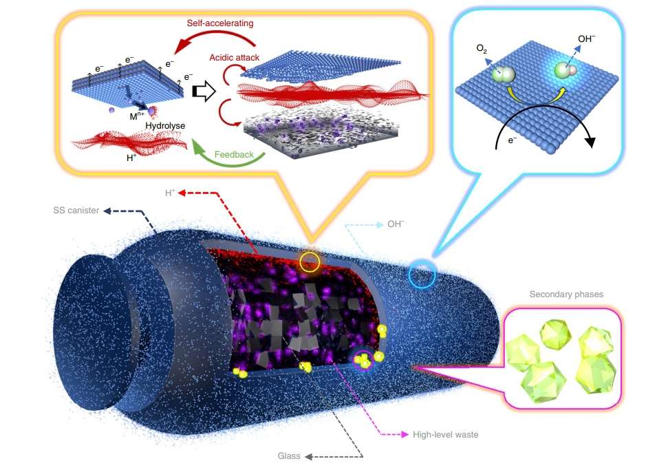 In the real-life scenario, the glass or ceramic waste forms would be in close contact with stainless steel canisters,” says Xiaolei. “Under specific conditions, the corrosion of stainless steel will go crazy. It creates a super-aggressive environment that can corrode surrounding materials.”