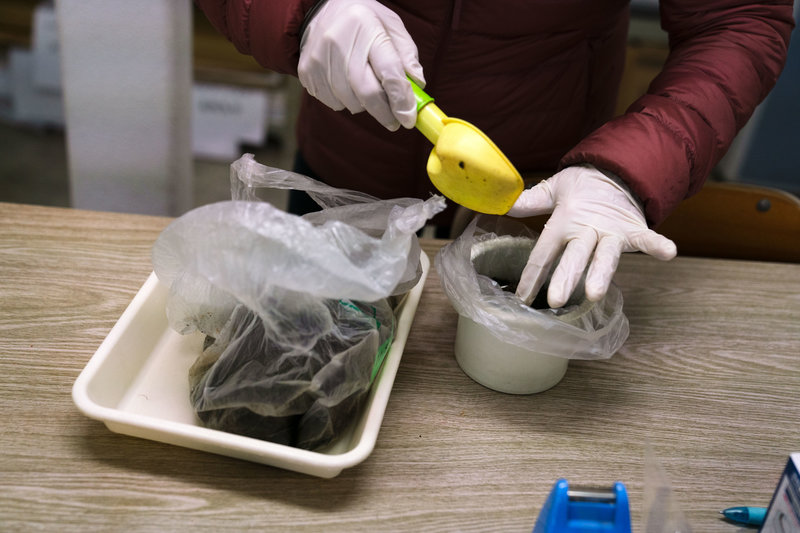 Inside the lab, the Kobayashis pair get to work. One measures out soil into small containers, the other starts labeling — so coordinated and practiced, it’s almost like a dance. They put the samples through a donated gamma counter, a big cylindrical machine that measures radioactive particles. Today, they’re testing soil from a nearby farm.