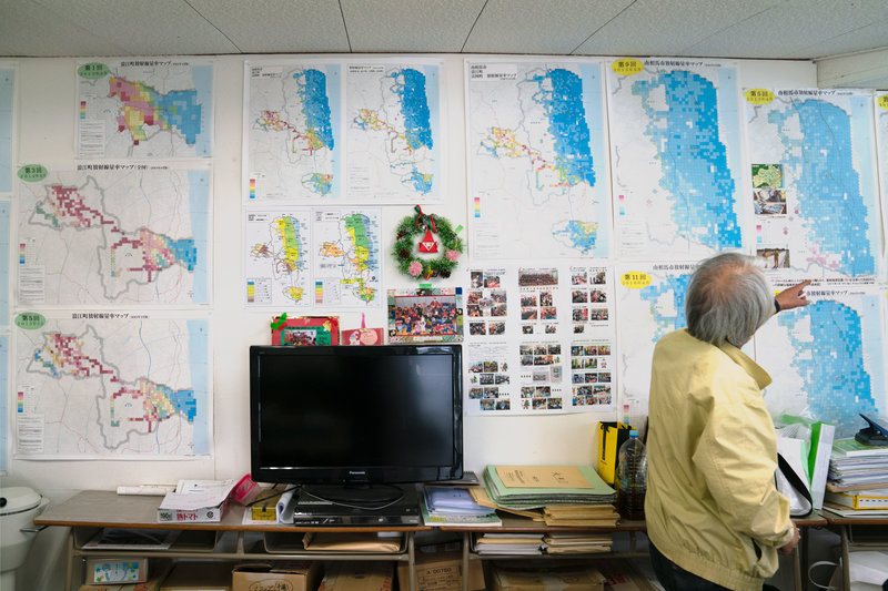 Takenori points to colorful radiation maps of the area hanging on the wall. The couple made them, along with a team of volunteers, using donated Geiger counters — hand-held devices used to measure radiation — over the past few years as more neighborhoods reopened to the public.