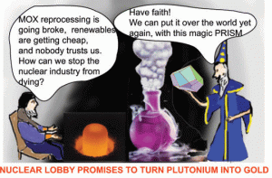 The plutonium fuel, obtained from spent reactor fuel will be fissioned and converted to shorter-lived isotopes — caesium and strontium which last 600 years instead of 500,000. Called “transmutation”, the industry claims that this is an excellent way to get rid of plutonium waste. But this is fallacious because only ten per cent fissions, leaving 90 per cent of the plutonium for bomb-making etc.