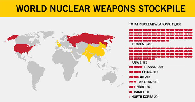 There are currently nine countries that possess nuclear weapons: the United States, China, Russia, the United Kingdom, France, India, Pakistan, Israel, and North Korea. ICAN calculated that they collectively spent $72.6 billion in 2020 on nukes. (picture below – a little out of date – 2019 )