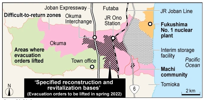 In a compromise with the central government, the town accepted a boundary that cuts across the Machi neighborhood of Okuma, creating a livable “enclave” surrounded on all sides by “no-entry” areas.