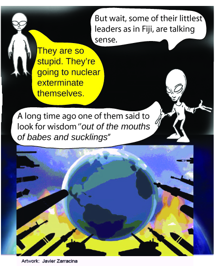 Today, as Fiji joins the Treaty, we hear a wise and sensible opinion on the way forward. We need to learn from those ”unimportant” little nations, from indigenous peoples, from ”ignorant” children and young people – because we sure ain’t getting any wisdom from the world ”leaders”