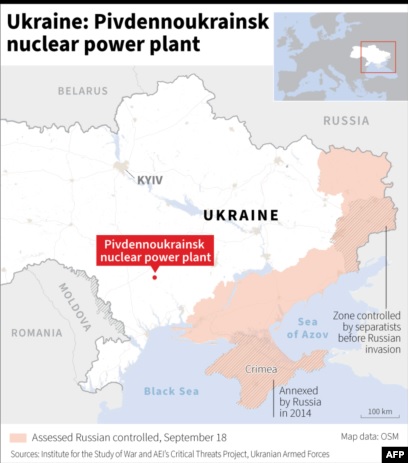 The Australian 22 Sept 22, A vast crater several metres deep in empty land strewn with wild grass bears witness to the shelling this week at the Pivdennoukrainskpower plant site in southern Ukraine, the latest sign of nuclear risk in the war-scarred nation.