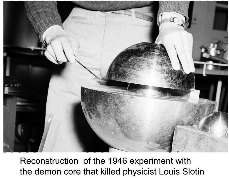 Physicists Harry Daghlian and Louis Slotin both suffered agonizing deaths after making minor slips of the hand while working on the plutonium orb known as the “demon core” at Los Alamos Laboratory in New Mexico.