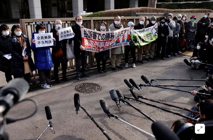 Support group members of plaintiffs show off banners reading “All innocent. Wrongful judgment” after the The Tokyo High Court upheld a not guilty verdict for former Tokyo Electric Power Company (TEPCO) executives of negligence over the 2011 Fukushima nuclear power station disaster, in front of the court in Tokyo, Japan, January 18, 2023
