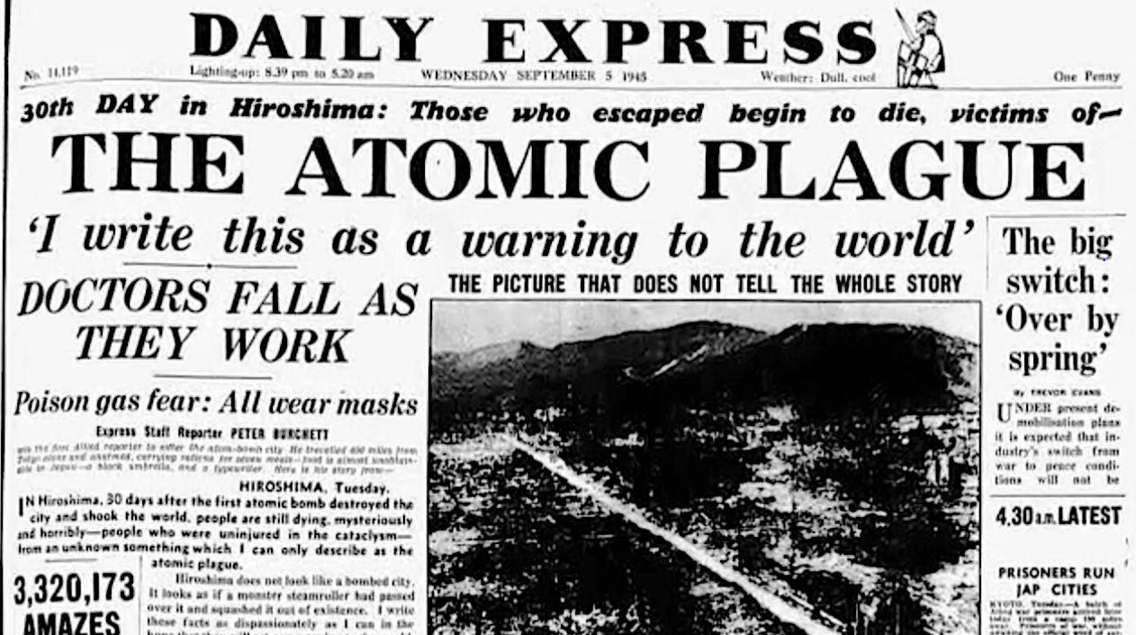 Despite the Allied officials’ attempts to censor the story, Burchett’s dispatch was published in The Daily Express on September 5, 1945. It is a piece of journalism that should be read over and over again — “as a warning to the world” — because like no other account, it brings home the inhuman reality of a nuclear holocaust.