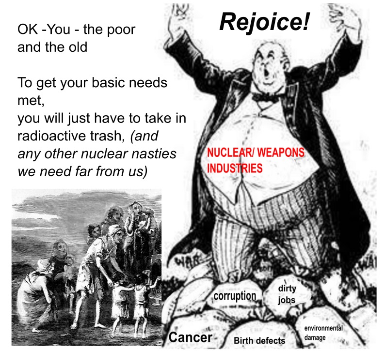 But then – hey presto ! Along comes the nuclear industry, and suddenly – purses open -and this poor community is suddenly grateful to have those essential facilities – that everyone else has got anyway , (without having to accept nuclear trash).