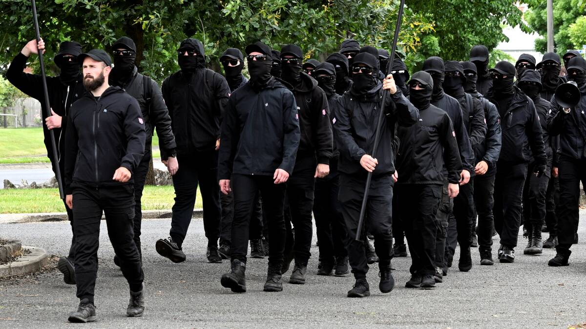 The picture above shows a a very recent march of neo-Nazis in Bendigo, a country town in Australia. Nazi symbolism, including the Nazi salute, are banned there by law. But they can still get their message across with their black outfits, nearly-Nazi symbolism, and hate speech.