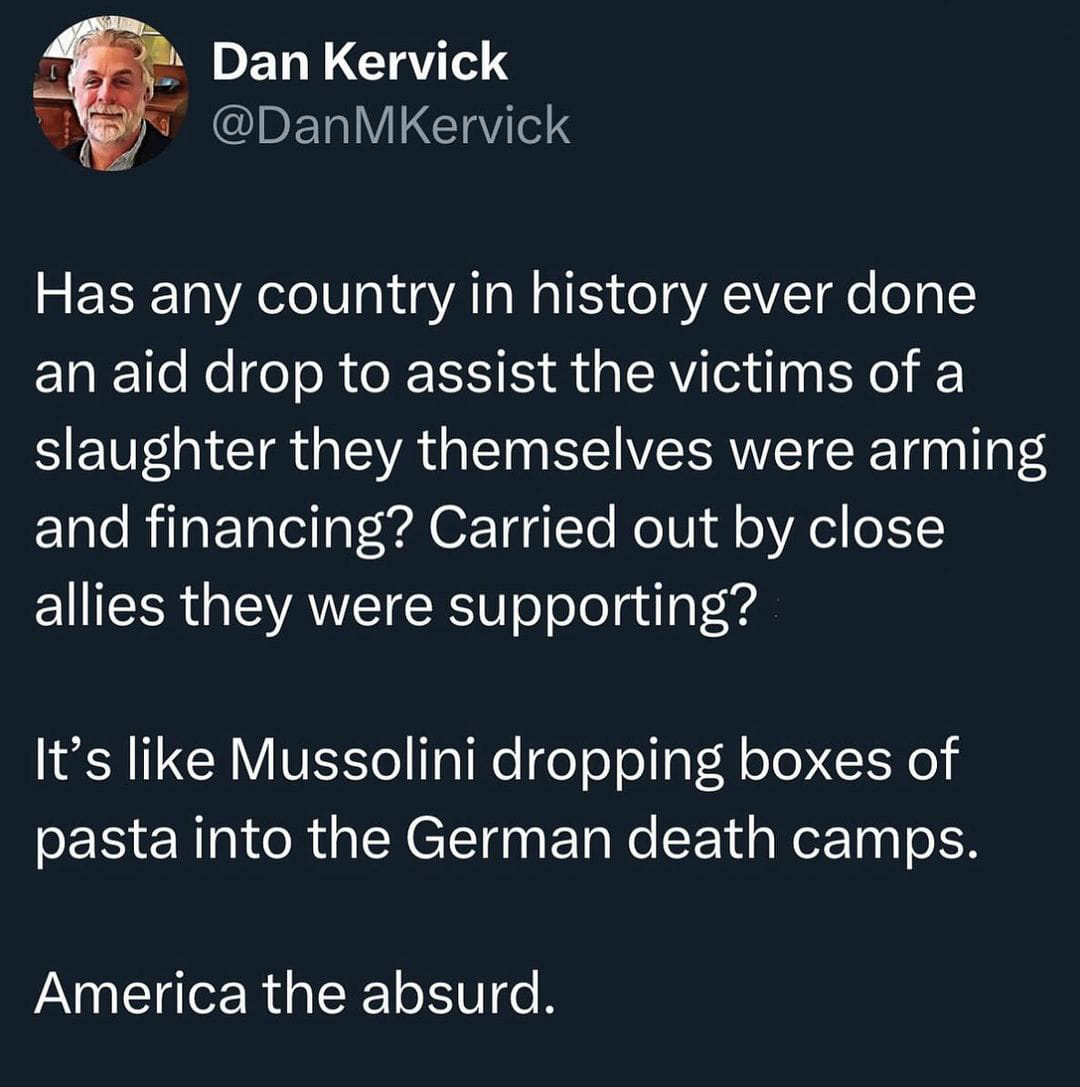 I couldn’t resist this facebook comment. It encapsulates the madness of what America and its allies – the Anglosphere and Europe, are doing about the Israeli genocide in Gaza.