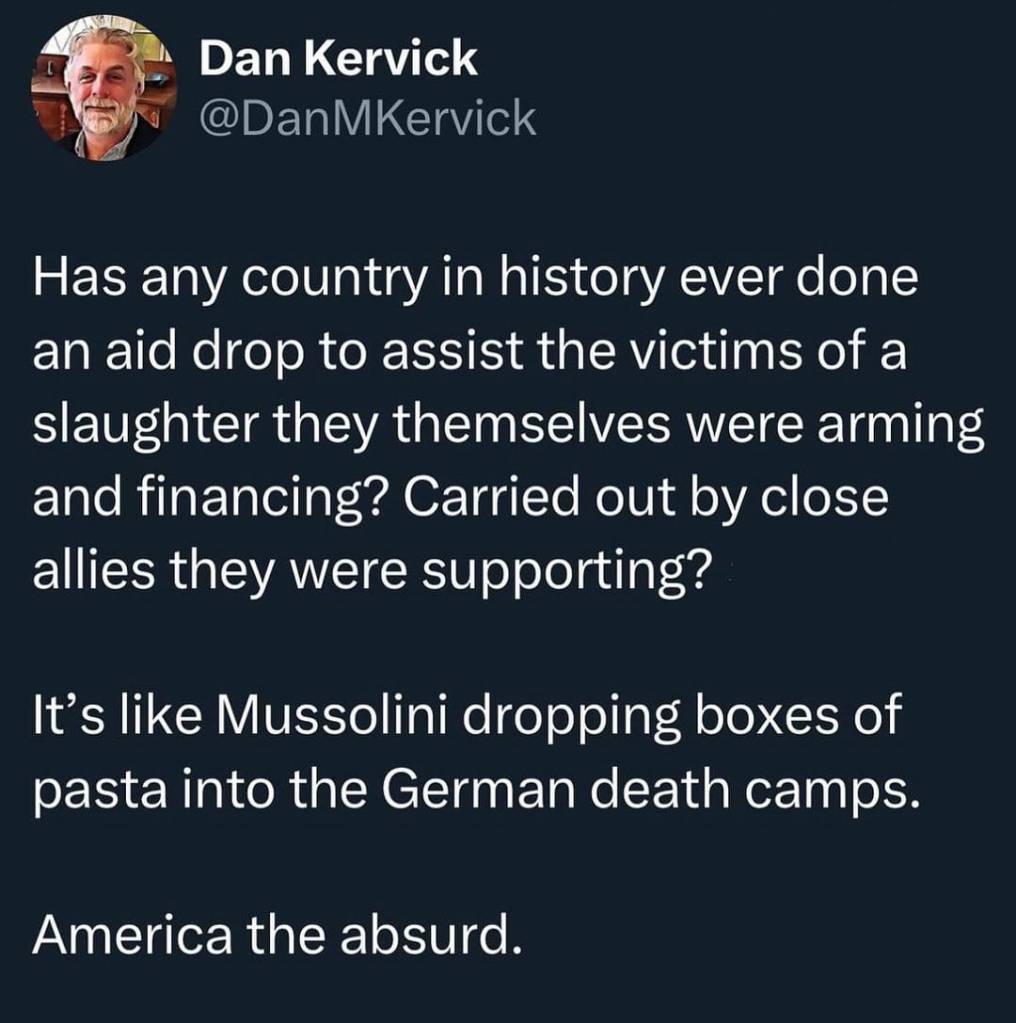 “We have a situation where the US is airdropping aid on day one, and Israel is dropping bombs on day two. And the American taxpayer is paying for the aid and the bombs.”