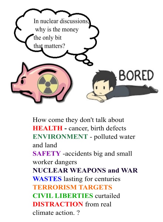 Still, perhaps I should not complain. Worrying about money might be the only thing saving us from nuclear follies. And I note that when they do their earnest costing of nuclear power – they talk only about building costs and electricity prices – and it’s already too expensive! What if they also counted the cost of nuclear waste disposal, and a thousand years of securing it?