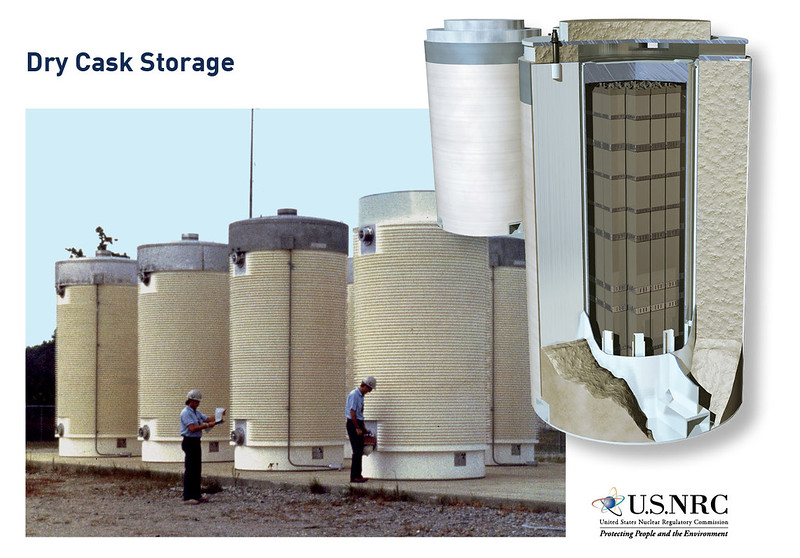 After being cooled under water for a minimum of three years, spent fuel assemblies can be transferred from pools to giant, hermetically sealed canisters of reinforced steel and concrete that shield plant workers and the public from ionizing radiation. This liquid-free method of storage, which cools the spent fuel assemblies by passive air convection, is called “dry cask storage.”