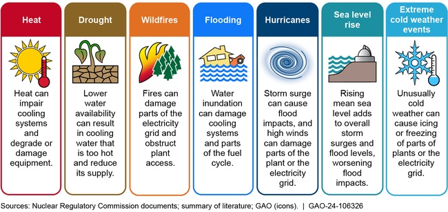 Climate change is expected to exacerbate natural hazards—including heat, drought, wildfires, flooding, hurricanes, and sea level rise. In addition, climate change may affect extreme cold weather events. Risks to nuclear power plants from these hazards include loss of offsite power, damage to systems and equipment, and diminished cooling capacity, potentially resulting in reduced operations or plant shutdowns.