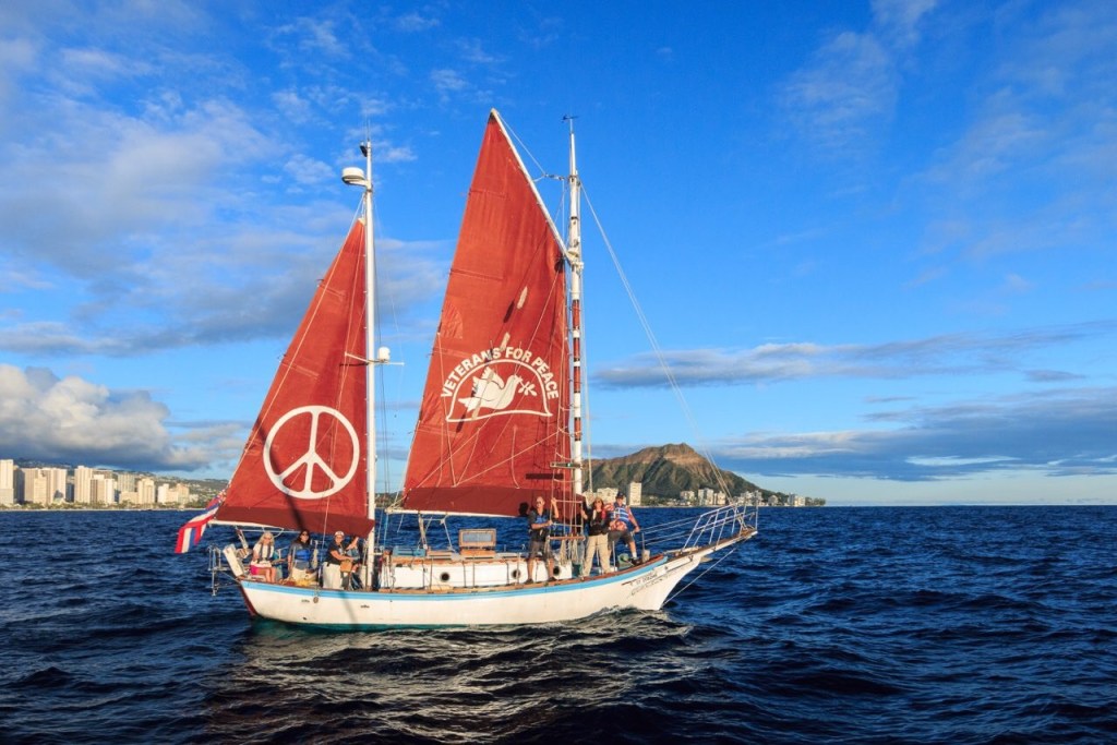 ………………………..now there is another. South Korean activists resisting the expansion of a U.S. military base on Jeju island were inspired by the prospect of the Golden Rule’s planned 2020 visit to Asia. Covid stopped us from making that voyage, but it didn’t stop them. They decided to restore another boat, Jonah’s Whale, and they sailed from Jeju to Okinawa, Taiwan, and several other island nations. Last year they completed a 107-day voyage, with the mission to unite the various struggles against the militarization of their islands.