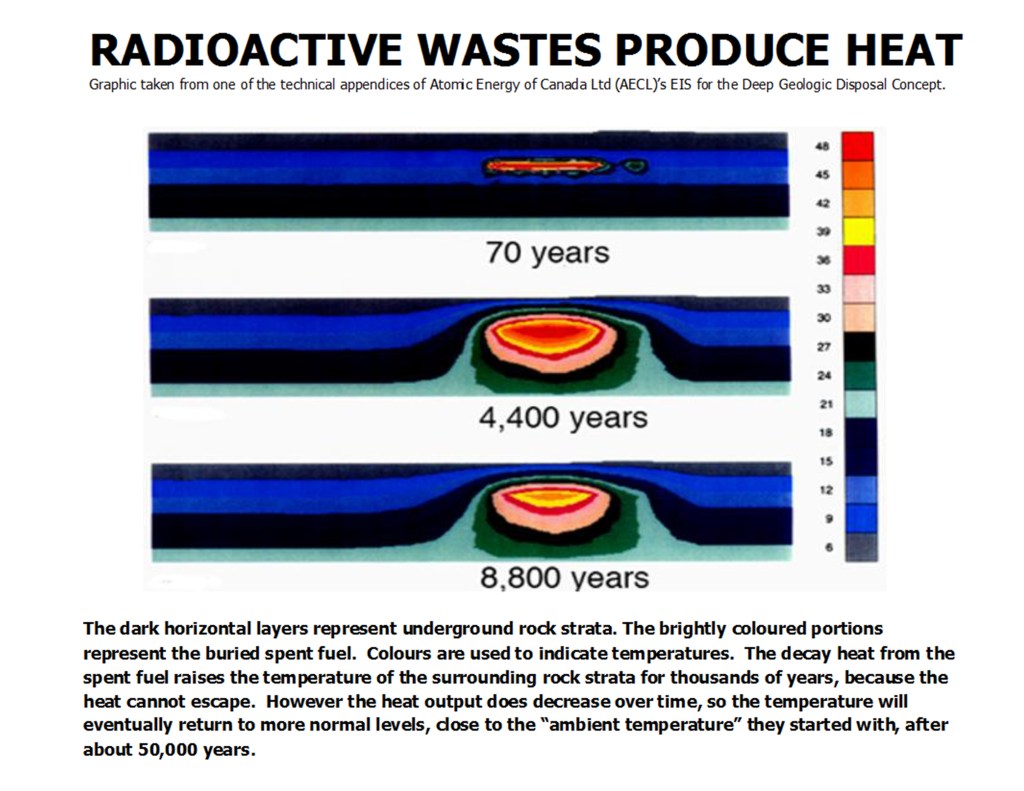 The most worrying aspect is an expected long-term “thermal pulse” from the entombed heat-producing radioactive waste. According to an Atomic Energy of Canada environmental study,1994, the DGR temperature could reach 230 degrees C. That intense heat would cause distortion and fracturing of host rock, impacting the structure of metallic containment casks.