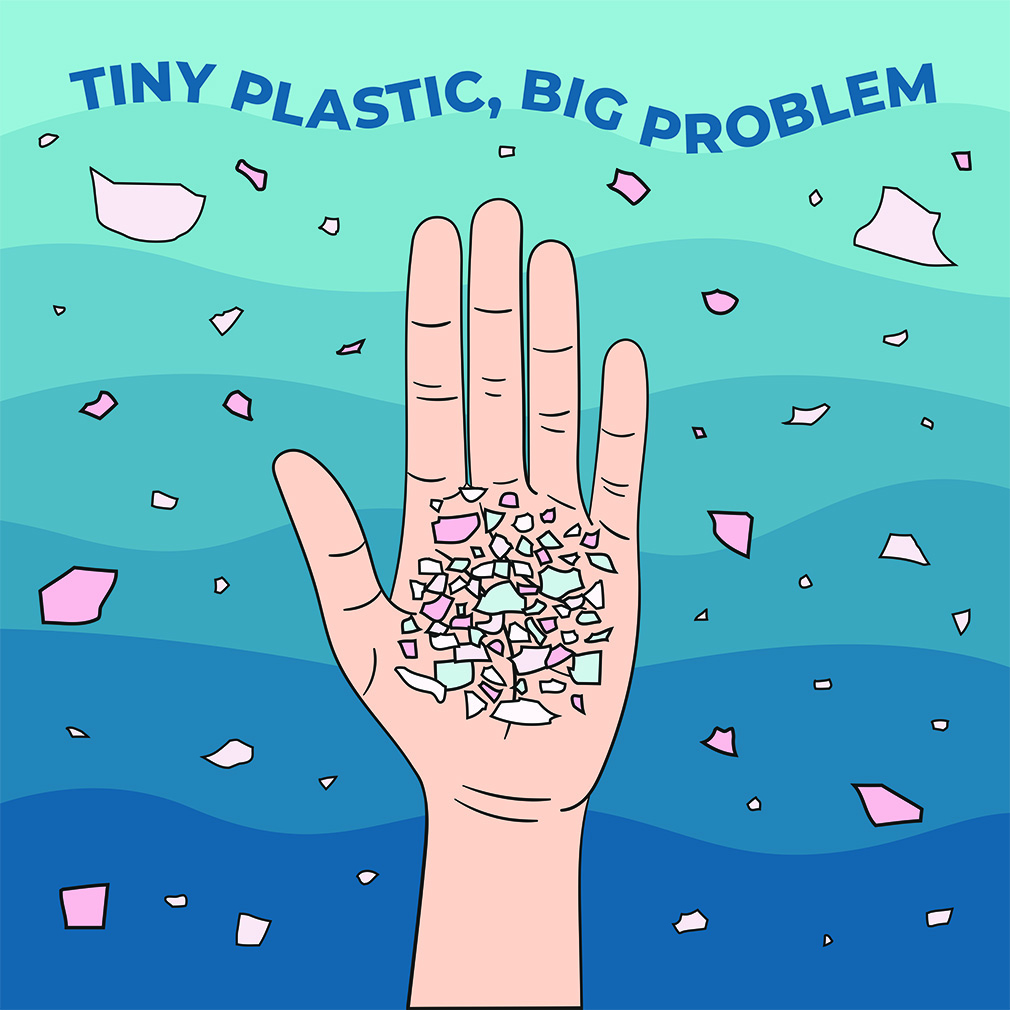 Micro beads on the palm. Microplastics in water from mismanaged plastic waste. Marine and ocean plastic pollution. Environmental problems. Hand drawn vector illustration.