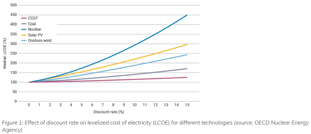 Specifically, when determining whether a government should invest in nuclear power, the cost depends on how much the government values cheap electricity for future generations. The decision to build a nuclear power station is a truly intergenerational one. This graph from the World Nuclear Association highlights how different discount rates affect the value for money of nuclear energy compared with other energy sources: