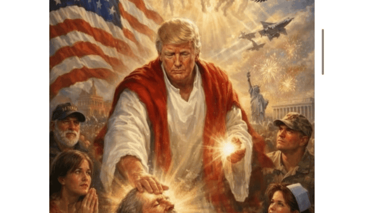 As the war abroad spirals and the stakes grow more dangerous by the day, the spectacle at home has taken on an almost surreal edge. President Donald Trump briefly posted—and then deleted—an AI-generated image depicting himself in Christ-like form, hands glowing as he “healed” the sick, wrapped in flags, fighter jets, and divine symbolism. When pressed, Trump dismissed the backlash, claiming it was merely an image of him as a doctor, not a messianic figure.