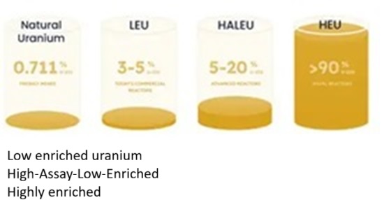 HALEU is a subcategory of low-enriched uranium (LEU), which is uranium enriched to below 20 percent uranium 235, and the IAEA has long considered LEU, including HALEU, to be “indirect-use material.” For the agency, HALEU cannot be used to make a nuclear weapon without converting it to highly enriched uranium (HEU) by further enriching it to 20 percent or above—a significant technical barrier for all but a few countries. Consequently, HALEU is subject to far less stringent international safeguards than HEU.
