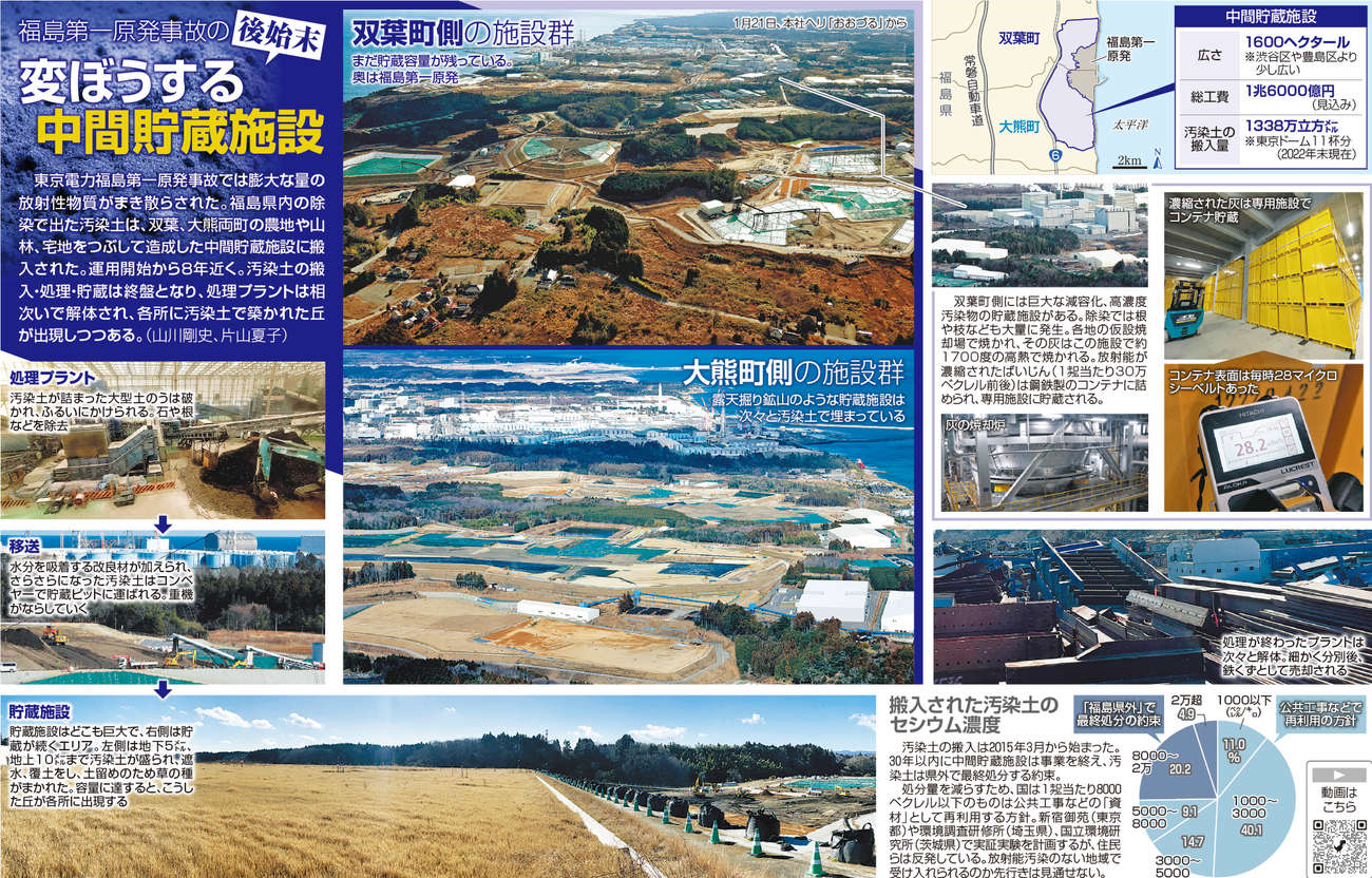February 06, 2023 The accident at TEPCO’s Fukushima Daiichi Nuclear Power Plant has spread an enormous amount of radioactive materials. Contaminated soil from the decontamination process in Fukushima Prefecture was delivered to an interim storage facility built by crushing farmland, forests, and residential areas in the towns of Futaba and Okuma. Nearly eight years have passed since operations began. The delivery, processing, and storage of the contaminated soil is now in its final stages, and the processing plants are being dismantled one after another, and hills made of the contaminated soil are appearing in various places. (Takeshi Yamakawa and Natsuko Katayama)
