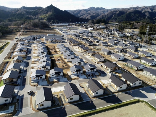 Photo taken Dec. 23, 2020, from a drone shows rows of public houses for residents who lost their homes in the disaster in Okuma, Fukushima Prefecture.